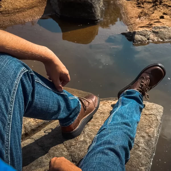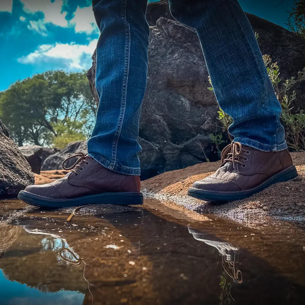 The Courteney Tracker in dark brown Buffalo leather is a versatile high-collared boot designed for dry, rugged terrain. Compact and supportive, it features a padded collar to protect the ankle and help keep out thorns, grit and insects — making it ideal for bush travel or day-long wear in the heat.