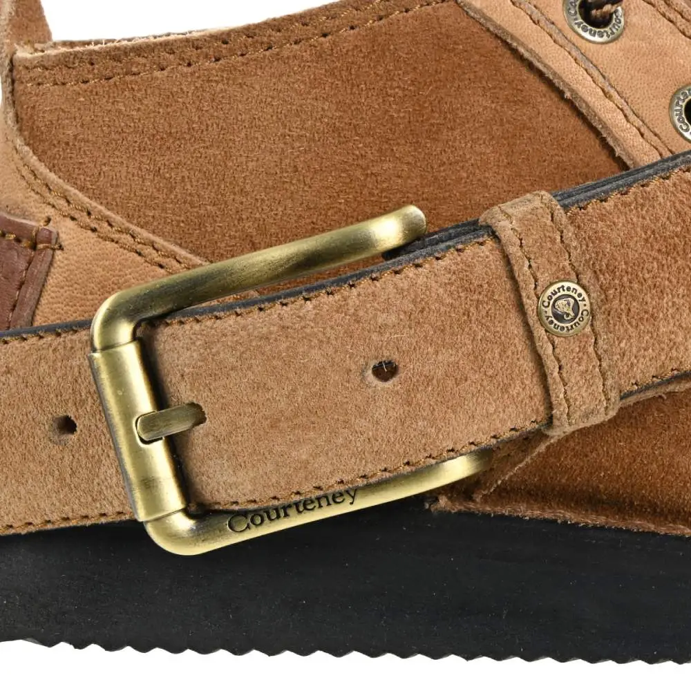 Solid brass buckle and rivets provide secure fastening, while all-round lockstitching enhances durability. This versatile light brown shade pairs seamlessly with Courteney suede veldtschoens, making it the ideal finishing touch to a coordinated outfit.